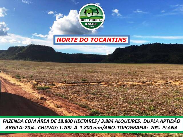 FAZENDA COM ÁREA DE 18.800 HECTARES / 3.884 ALQUEIRES. REGIÃO NORTE DO TOCANTINS. COM DUPLA APTIDÃO. TEOR DE ARGILA: 20% ÍNDICE PLUVIOMÉTRICO 1.700 À 1.800 mm/ANO. TOPOGRAFIA: 70% PLANA. ESTRUTURA: CASA SEDE, ESCRITÓRIO, 11 CASAS DE FUNCIONÁRIOS. TODA MONTADA NA PECUÁRIA: 93 DIVISÕES DE PASTOS, COM CORREDORES DE ACESSOS. APROXIMADAMENTE 10.000 CABEÇAS DE GADO (NELORE, ANGUS). ESTRUTURA DE CONFINAMENTO PARA 1.000 BOIS. PATRIMÔNIO AMBIENTAL: 36 REPRESAS COM NASCENTES. PORTEIRA FECHADA: SEMOVENTES E IMPLEMENTOS AGRÍCOLAS (8 TRATORES, 2 PLANTADEIRAS, 2 CALCARIADORAS, 2 CAMINHÕES, 5 GRADES ARADORAS, 1 NIVELADORA, 1 BALANÇA). INVESTIMENTO: R$ 350.000.000,00 (TREZENTOS E CINQUENTA MILHÕES DE REAIS). PRAZO DE PAGAMENTO: 8 ANOS NEGOCIÁVEL. NEGOCIAÇÃO COM CORRETOR DE FAZENDAS HUGO FERREIRA