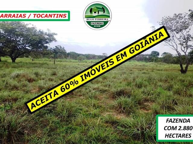 FAZENDA COM 2.880 HECTARES / 595 ALQUEIRES À 17 KM DE ARRAIAS/TO. 346 KM DE GURUPI. 414 KM DE PALMAS. DUPLA APTIDÃO. ESTANDO COM 1.000 HECTARES EM PASTOS. FAZENDA TODA ABERTA. BOA TOPOGRAFIA: 100% PLANA. ESTRUTURA: CASA, CURRAL. DOCUMENTOS: ESCRITURADA. ACEITA 60% EM PERMUTA POR IMÓVEIS E FAZENDA EM GOIÂNIA. INVESTIMENTO: R$ 25.000.000,00 (VINTE E CINCO MILHÕES DE REAIS). NEGOCIAÇÃO COM CORRETOR DE FAZENDAS HUGO FERREIRA