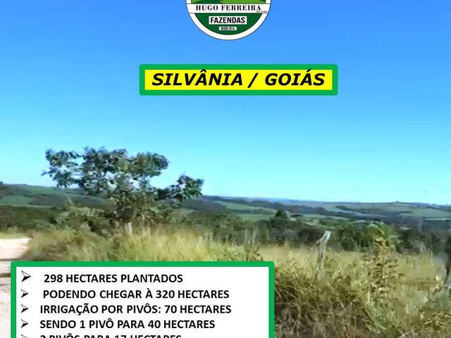 HUGO FERREIRA VENDE FAZENDA EM SILVÂNIA / GOIÁS COM ÁREA DE 493,68 HECTARES / 102 ALQUEIRES. DUPLA APTIDÃO AGRICULTURA E PECUÁRIA. EXCELENTE LOCALIZAÇÃO: APENAS 2 KM DO ASFALTO. ACESSO RÁPIDO E FÁCIL. ESTRUTURA COMPLETA: ENERGIA ELÉTRICA TRIFÁSICA COM 3 PONTOS DE TRANSFORMADOR. 2 CASAS SEDES BOAS COM 4 QUARTOS CADA. CASA DE CASEIRO. CURRAL NOVO NA CORDOALHA. BRETE. EMBARCADOR. MODERNA BALANÇA ELETRÔNICA. ATUALMENTE COM 298 HECTARES PLANTADOS. PODENDO CHEGAR À 320 HECTARES. FARTURA DE ÁGUA: POTENCIAL IRRIGAÇÃO POR PIVÔS: 70 HECTARES IRRIGÁVEIS. SENDO 1 PIVÔ PARA 40 HECTARES E 2 PIVÔS PARA 17 HECTARES. 8 NASCENTES. RIBEIRÃO ATRAVESSA AO MEIO A FAZENDA.