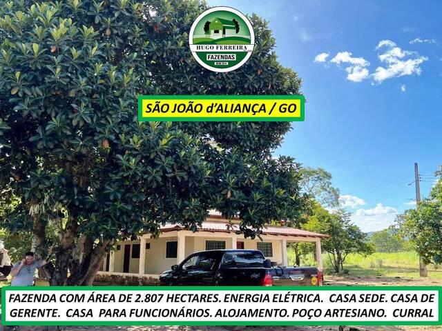 HUGO FERREIRA VENDE FAZENDA EM GOIÁS/ SÃO JOÃO D'ALIANÇA COM ÁREA DE 2.807 HECTARES / 580 ALQUEIRES. DUPLA APTIDÃO: AGRICULTURA E PECUÁRIA CICLO COMPLETO: CRIA, RECRIA E ENGORDA. LOGÍSTICA CONVERGENTE: RODOVIA BR 116 PASSA EM FRENTE (EM BREVE ASFALTO). EXCELENTE TEOR DE ARGILA: VARIANDO DE 35% À 50%. ÍNDICE PLUVIOMÉTRICO: 1.600 mm/ANO. 22 REPARTIÇÕES DE PASTO PARA MANEJO EFICIENTE. ÁREA AGRICULTÁVEL: 2.000 HECTARES. ÁREA JÁ GRADEADA: 670 HECTARES, VAI CHEGAR Á 800 HECTARES. ÁREA DE 850 HECTARES MEDIDA PARA INSTALAÇÃO DE IRRIGAÇÃO POR PIVÔS. FARTURA DE ÁGUA DE 2 RIOS: CORUJA E RIO FARIAS COM GRANDE POTENCIAL PARA IRRIGAÇÃO POR PIVÔS. ESTRUTURA: 2 PADRÕES DE ENERGIA ELÉTRICA. CASA SEDE. CASA DE GERENTE. CASA PARA FUNCIONÁRIOS. ALOJAMENTO. POÇO ARTESIANO. CURRAL COMPLETO COM BRETE, EMBARCADOR E BALANÇA PARA 1.300 CABEÇAS DE GADO. VALOR HECTARE: R$ 22.306,00. VALOR DO ALQUEIRE: R$ 107.973,00. INVESTIMENTO: R$ 65.000.000,00. NEGOCIAÇÃO COM CORRETOR DE FAZENDAS HUGO FERREIRA. CRECI F 24.398 GO