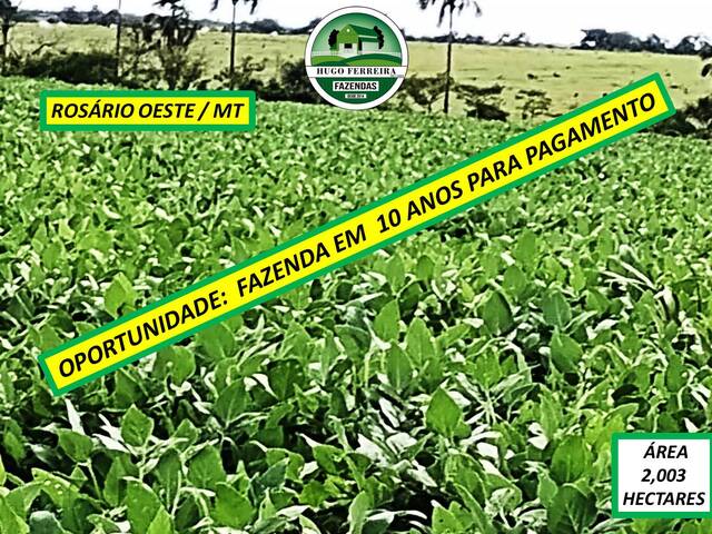 HUGO FERREIRA VENDE FAZENDA A PRAZO NO MATO GROSSO. COM ÁREA DE 2,003 HECTARES / 414 ALQUEIRES EM ROSÁRIO OESTE. REGIÃO DE SAFRA E SAFRINHA. TEOR DE ARGILA: 40% SUBINDO. HOJE ESTÁ EM PASTO COM 600 CABEÇAS. TERRA DE ALGODÃO. EXCELENTE PRODUTIVIDADE: COLHE 81 SACAS POR HECTARE. MILHO COLHE 180 SACAS. LOGÍSTICA CONVERGENTE: SÓ 4 KM DO ASFALTO (MT-414). À 12 KM DO SILO E 15 KM DE OUTRO SILO. FAZENDA RICA EM ÁGUA, COM POSSIBILIDADE DE INSTALAR 4 PIVÔS PARA IRRIGAÇÃO. ESTRUTURA: ENERGIA ELÉTRICA. INTERNET. CASA. VALOR: 300.000 SACAS DE SOJA. R$ 50.100.000,00. ENTRADA: 60.000 SACAS. MAIS 9 PARCELAS DE 27.000 SACAS DE SOJA (COTAÇÃO SOJA ROSÁRIO OESTE/MT). NEGOCIAÇÃO DE PREÇO E PRAZOS COM CORRETOR DE FAZENDAS HUGO FERREIRA. CRECI F 24.398 GO